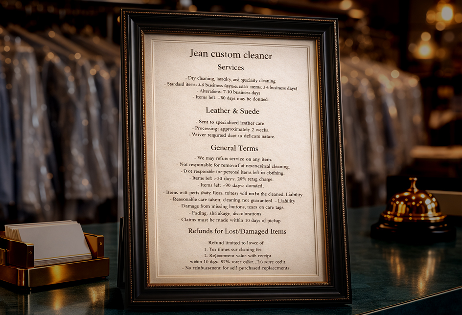 At Jeans Custom Cleaners, we take reasonable care of every garment to return your clothes in great shape. In the rare instance that an item goes missing or is damaged during the cleaning process, our refund policy covers the lower of either ten times our cleaning fee or the replacement value (with receipt). Please inspect your items and make any claims within 10 days of pickup.